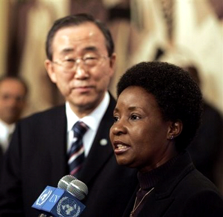 The United Nations’ Deputy Secretary-General Asha-Rose Migiro at the microphone as General-Secretary Ban Ki Moon looks on. (photo courtesy of the United Nations)