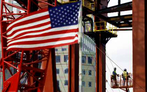 Freedom Tower workers go up on a lift as a U.S. flag waves in the foreground. (photo by Shannon Stapleton for Reuters)
